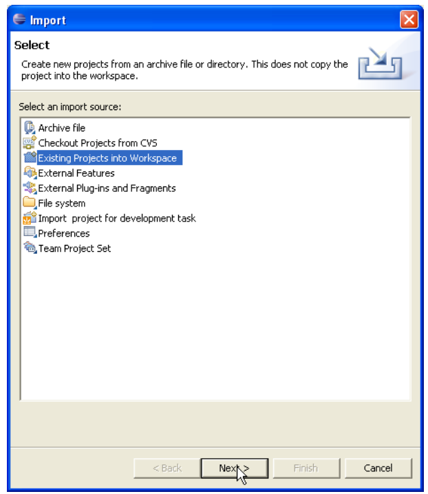 Proces importu można następnie uruchomić w menu kontekstowym eksploratora pakietów. W tym celu należy wybrać akcję [Existing project into workspace] dla importu.