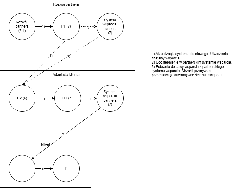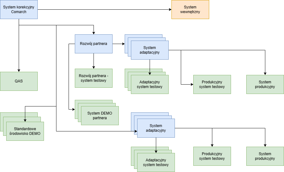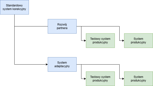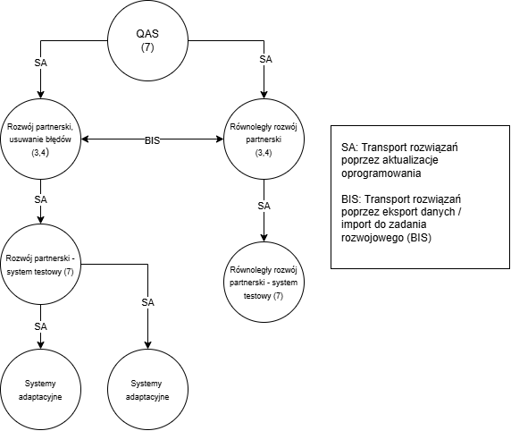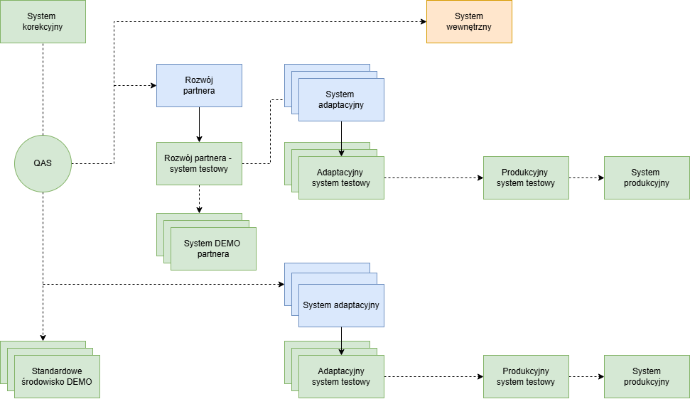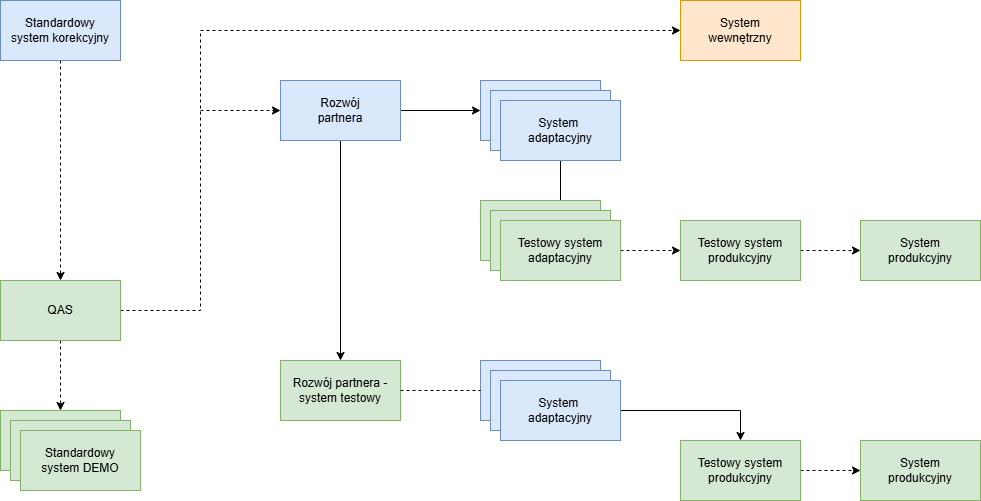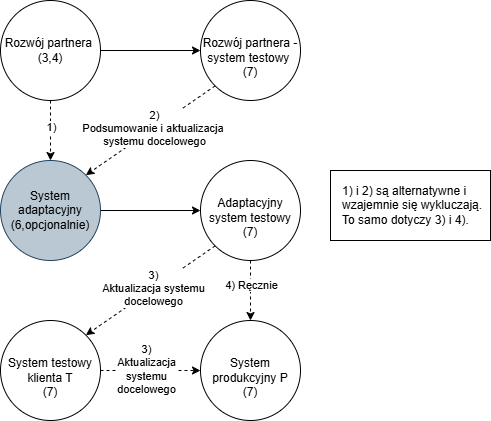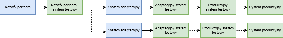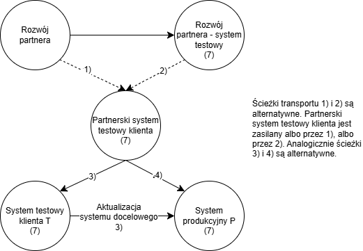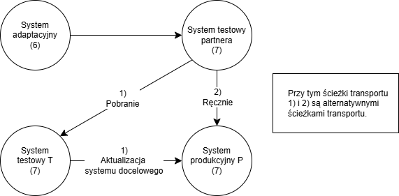 Pomiędzy systemem deweloperskim (rozwój partnera, system adaptacyjny) powinien znajdować się w topologii transportu co najmniej jeden system testowy.