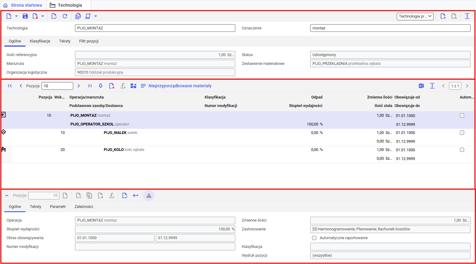 Obszar roboczy aplikacji Technologia składa się z tabeli i danych szczegółowych pozycji.