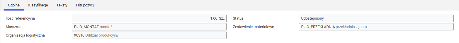 Obszar umożliwia podgląd danych pozycji, które zostały pobrane z aplikacji Marszruty. Aplikacja Technologia nie umożliwia edycji pozycji, możliwy jest tylko ich podgląd. Pola odpowiadają polom aplikacji Marszruta, w związku z tym w obszarze danych pozycji możliwe jest wyświetlenie tylko pozycji operacji.