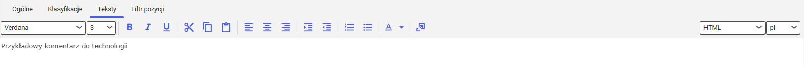 - Nagłówka – zawierającego przyciski akcji, pola niezbędne do jednoznacznej identyfikacji technologii, a także dodatkowe dane znajdujące się na następujących zakładkach:
