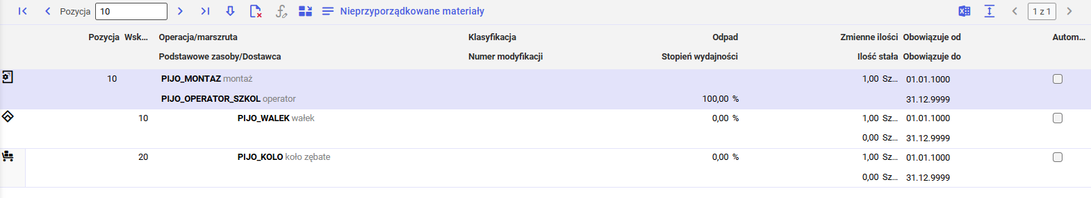 Po jej utworzeniu i zapisaniu w obszarze roboczym wyświetlane są pozycje marszruty wraz z przypisanymi do nich zasobami głównymi. Jeśli użytkownik korzysta z wersjonowania danych podstawowych, prezentowane są wyłącznie pozycje marszruty w aktualnie zatwierdzonej wersji.