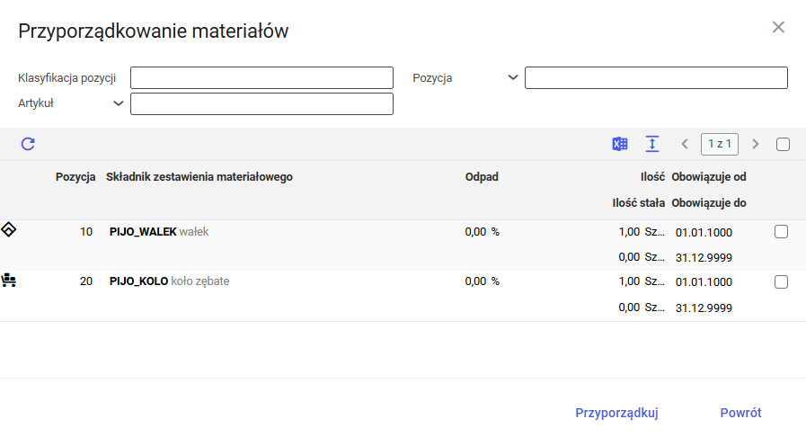 - Klasyfikacja pozycji – umożliwia filtrowanie materiałów zgodnie z przypisaną klasyfikacją planów produkcji