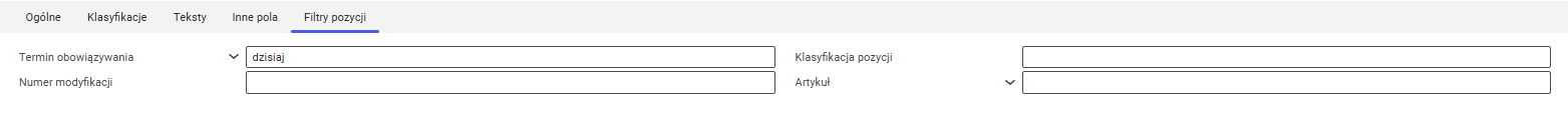 - Termin obowiązywania – umożliwia filtrowanie danych w tabeli według daty ich obowiązywania. Domyślnie pole przybiera wartość aktualnej daty.