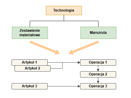 Technologia składa się zazwyczaj z Zestawienia materiałowego oraz Marszruty. Poniższa grafika przedstawia przykładową strukturę technologii produkcji.