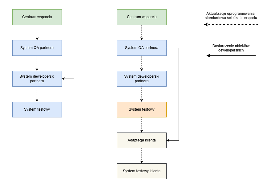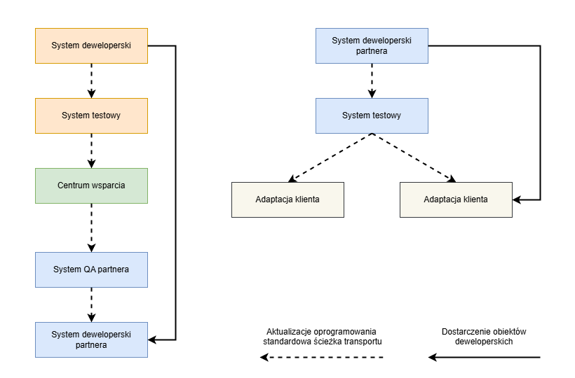 Za pomocą aplikacji Wydanie obiektów deweloperskich możliwe jest transportowanie wybranych obiektów deweloperskich wzdłuż standardowych ścieżek transportu, przy czym wybrane systemy w ścieżce mogą zostać pominięte. Przykładowo można przetransportować obiekty deweloperskie z partnerskiego systemu deweloperskiego do systemu adaptacji klienta bez wcześniejszego wgrania ich do powiązanego systemu testów deweloperskich (zob. rysunek). Takie działanie może być wymagane, gdy z partnerskiego rozwoju obsługiwanych jest kilka adaptacji klienta, a określone poprawki są krytyczne dla konkretnego systemu adaptacji klienta, mimo że nie znajdują się jeszcze w systemie testów deweloperskich.
