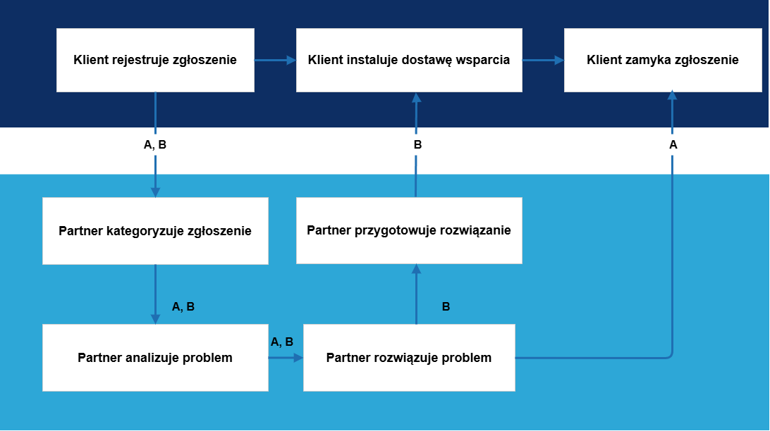 Jeśli klient ma problem, przesyła zapytanie o wsparcie techniczne. Obsługa zapytania o wsparcie techniczne jest zasadniczo niezależna od tego, czy jest to błąd, propozycja ulepszenia czy problem ze zrozumieniem ze strony klienta. Obsługa zapytania o wsparcie techniczne przez partnera może być z grubsza podzielona na następujące procesy: