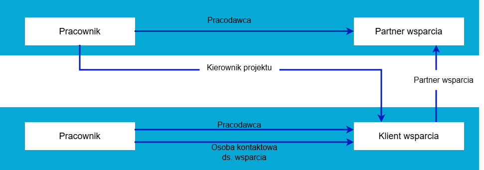 Każdy klient pomocy technicznej posiada relację partnerską typu partner wsparcia ze swoim partnerem pomocy technicznej. Pracownik partnera wsparcia, odpowiedzialny za obsługę klienta, posiada relację partnerską typu kierownik projektu z klientem wsparcia. Wszyscy pracownicy tworzący zgłoszenia pomocy technicznej dla danego klienta posiadają relację partnerską typu osoba kontaktowa ds. wsparcia z tym klientem.