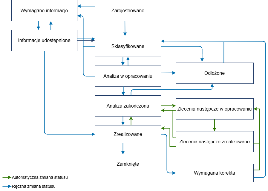 | Analiza w opracowaniu | • Odłożone • Sklasyfikowane • Wymagane informacje • Analiza zakończona |