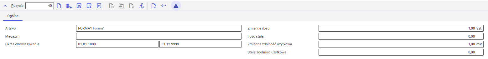• Zmienna zdolność użytkowa – w tym polu należy określić wartość zdolności użytkowej środka produkcyjnego, która zmienia się w zależności od ilości artykułów do wyprodukowania w zleceniu produkcyjnym