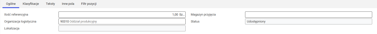 • Lokalizacja – wyświetla organizację zdefiniowanego magazynu przyjęcia. Pole uzupełniane jest automatycznie i nie jest dostępne do edycji.