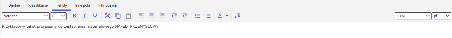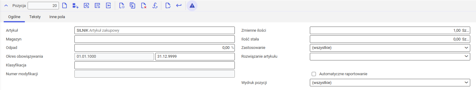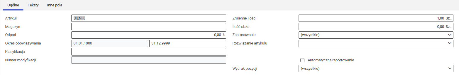 Po wybraniu przycisku [Nowa pozycja zestawienia materiałowego] zmienia się widok edytora pozycji. Na zakładce Ogólne pojawiają się dodatkowe pola. Budowa zakładek Teksty oraz Inne pola pozostaje bez zmian.