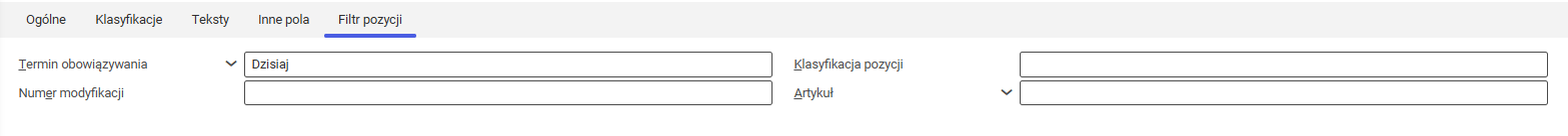 • Termin obowiązywania – umożliwia filtrowanie wyświetlanych pozycji według daty ich obowiązywania. Domyślnie pole przybiera wartość aktualnej daty.