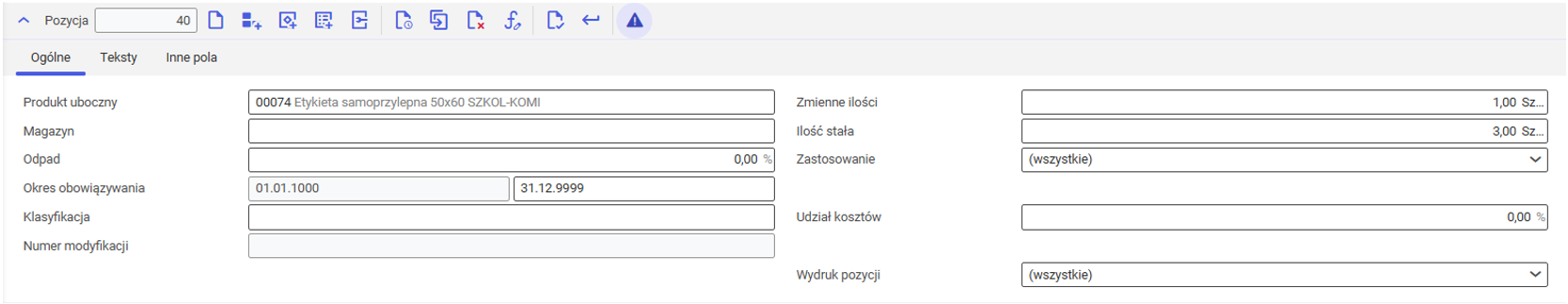 Po wybraniu przycisku [Nowa pozycja produktu ubocznego] zmienia się widok edytora pozycji. Na zakładce Ogólne pojawiają się dodatkowe pola. Budowa zakładek Teksty oraz Inne pola pozostaje bez zmian.