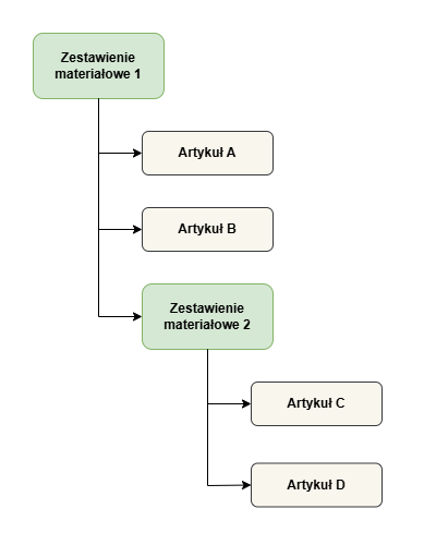 Zestawienie materiałowe może obejmować zarówno pojedyncze artykuły, jak i inne zestawienia materiałowe. Poniższa grafika przedstawia przykładową strukturę zestawienia materiałowego.