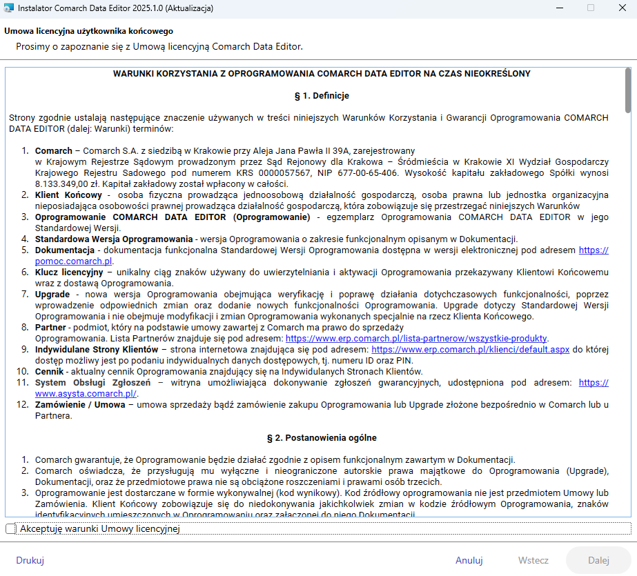 W pierwszym kroku aktualizacji pojawi się prośba o zaakceptowanie umowy licencyjnej.