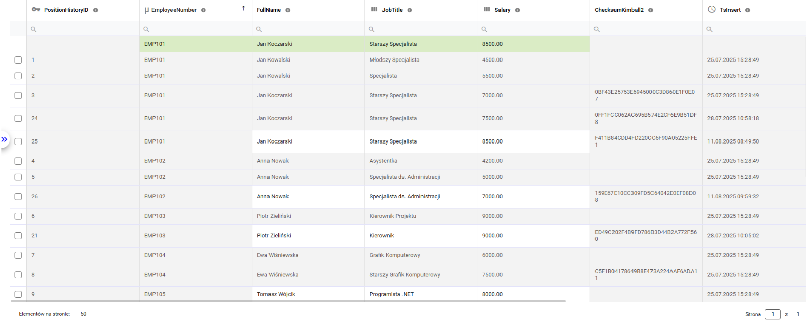 Istnieje możliwość dodawania wierszy o takim samym kluczu biznesowym jednak najnowszy wiersz w tabeli z takim samym kluczem biznesowym musi być wierszem nieaktualnym czyli wyszarzonym.
