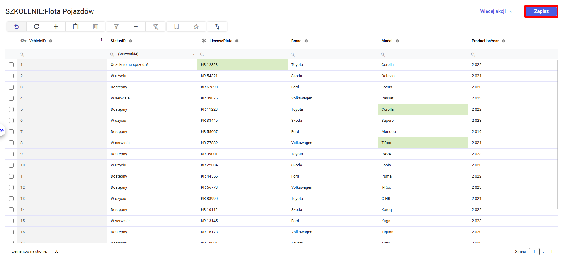 Aplikacja Comarch Data Editor umożliwia edycję wierszy. Zarówno całego wiersza, jak i pojedynczego pola rekordu. Jest to możliwe poprzez kliknięcie w wybrany rekord za pomocą lewego przycisku myszy. Po wpisaniu nowej wartości zmiany zatwierdzamy przyciskiem . Edytowane dane podświetlają komórkę na kolor zielony.