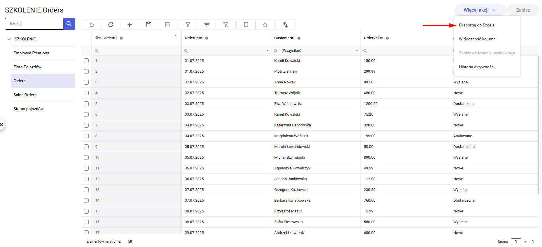 Po wybraniu tabeli z lewego panelu aplikacji i kliknięciu przycisku „Eksportuj do Excela” zostanie automatycznie pobrany plik w formacie .xlsx.