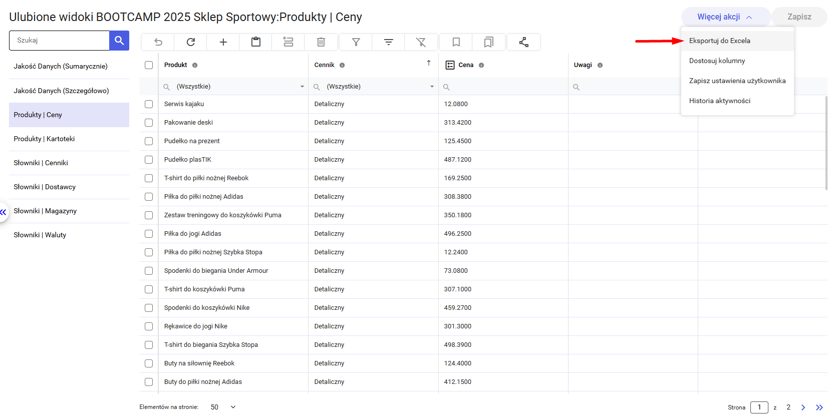 Dane widoczne w tabeli, mogą zostać wyeksportowane do Excela. Można to zrobić poprzez rozwinięcie listy „Więcej akcji”, następnie należy wybrać