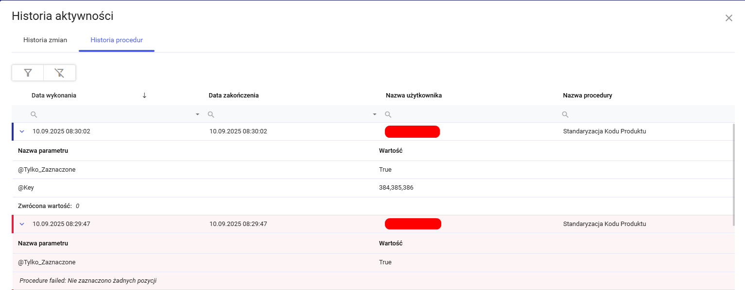 - Nazwa użytkownika – Informacja o użytkowniku, który uruchomił procedurę.