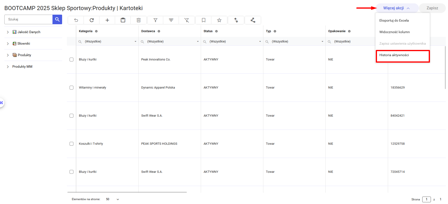 Okno „Historia aktywności” umożliwia śledzenie historii akcji uruchamianych procedur w ramach danego widoku.