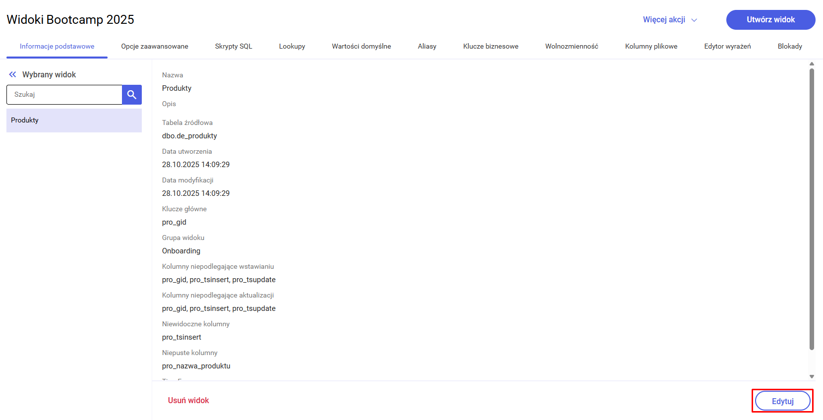 - Data utworzenia – data utworzenia widoku