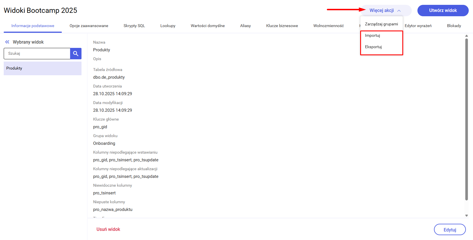 W zakładce Widoki istnieje możliwość zaimportowania oraz wyeksportowania widoków do/z innego środowiska. Mechanizm przenosi tylko definicje danego widoku, bez jego danych, historii zmian w tym obiekcie, uprawnień powiązanych z tym obiektem oraz bez indywidualnych preferencji danego użytkownika względem tego obiektu. Aby umożliwić import lub eksport należy rozwinąć menu kontekstowe „Więcej akcji”.