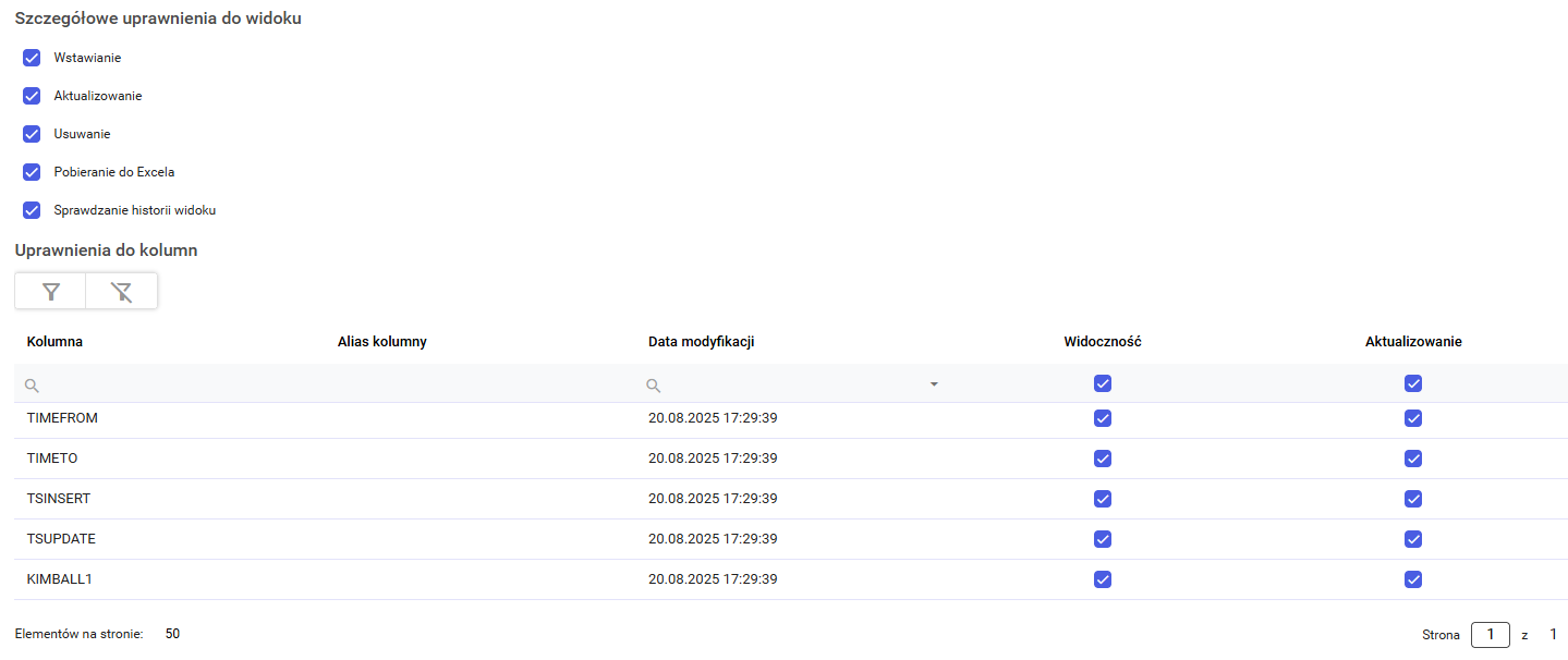 - Uprawnienia kolumn – uprawnienia dla kolumn, przy użyciu „checkboxów”