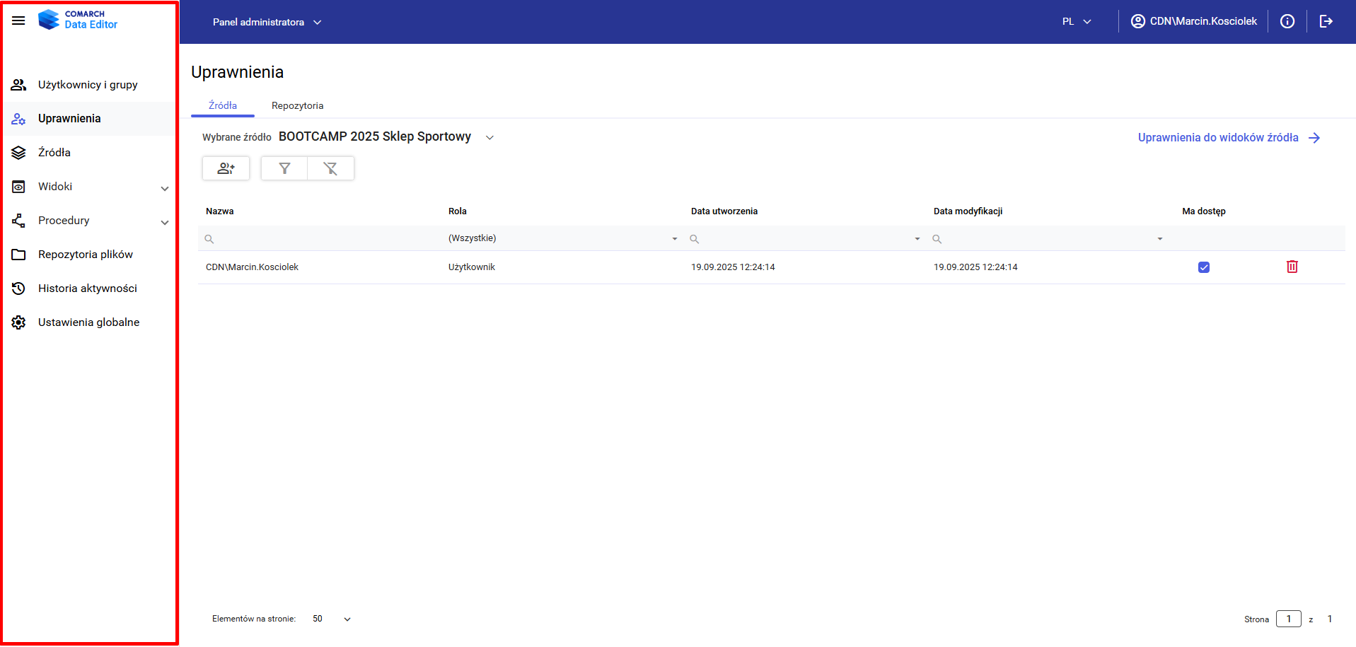 W lewej sekcji aplikacji znajduje się panel rozwijany i zwijany za pomocą przycisku . Po rozwinięciu paska, administrator ma do dyspozycji zakładki: „Użytkownicy i grupy”, „Uprawnienia”, „Źródła”, „Widoki”, „Procedury”, „Repozytoria plików”, „Historia aktywności” oraz „Ustawienia globalne”.