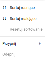 Sortowanie w aplikacji jest również dostępne po kliknięciu prawym przyciskiem myszy na nagłówek kolumny. Po wyświetleniu poniższego okna użytkownik może wybrać jedną z dostępnych opcji.