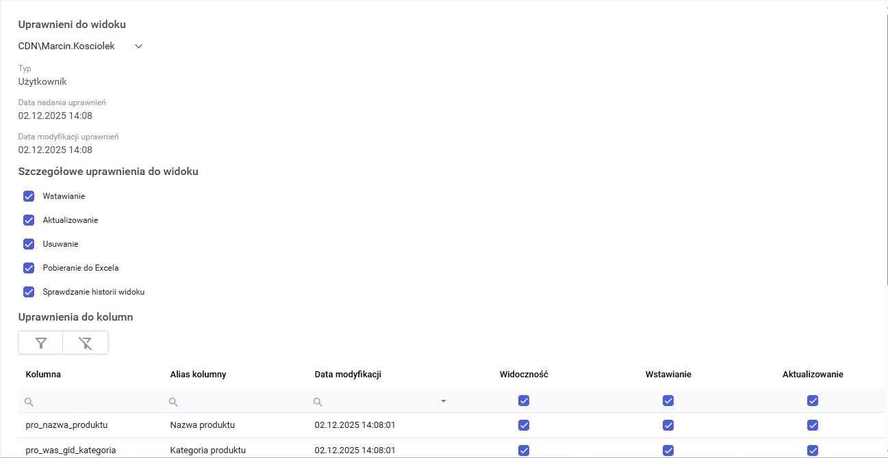 Po przewinięciu okna w dół, dostępna jest sekcja uprawnień do procedur. Analogicznie do widoków, zawiera ona listę wszystkich procedur i kategorii, dla których można nadać lub odebrać prawo do ich wykonywania. Dodatkowo wyświetlana jest informacja o dacie modyfikacji i utworzenia procedury.