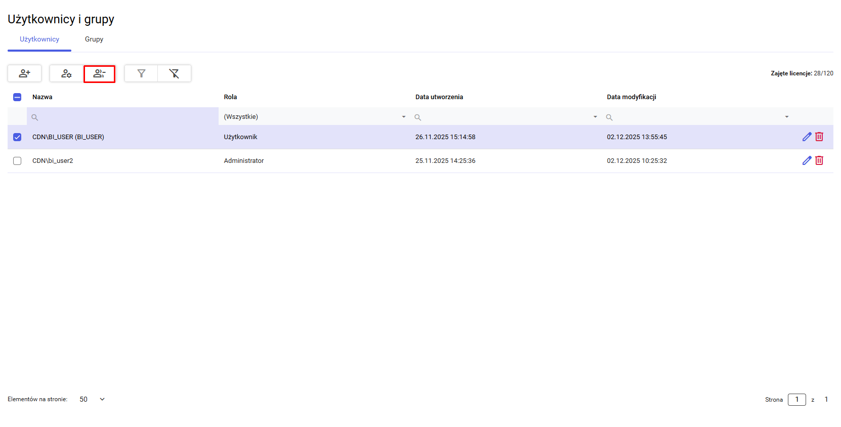 Druga metoda umożliwia usunięcie jednego lub wielu kont jednocześnie za pomocą operacji grupowych. W tym celu należy zaznaczyć pola wyboru (checkboxy) znajdujące się przy nazwach użytkowników, a następnie skorzystać z przycisku usuwania, oznaczonego ikoną