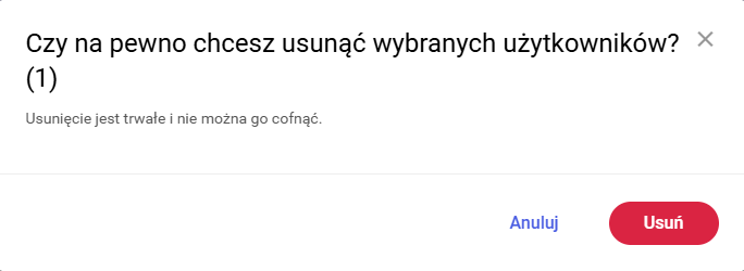 Po jej kliknięciu aplikacja wyświetla komunikat z prośbą o potwierdzenie procesu usunięcia użytkownika, co zostało przedstawione na poniższym rysunku.