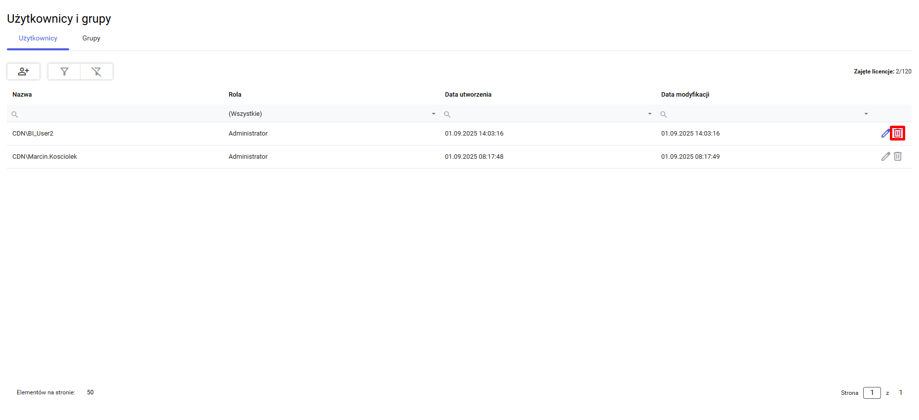Administrator ma możliwość usunięcia wybranego użytkownika za pomocą dedykowanej ikony .