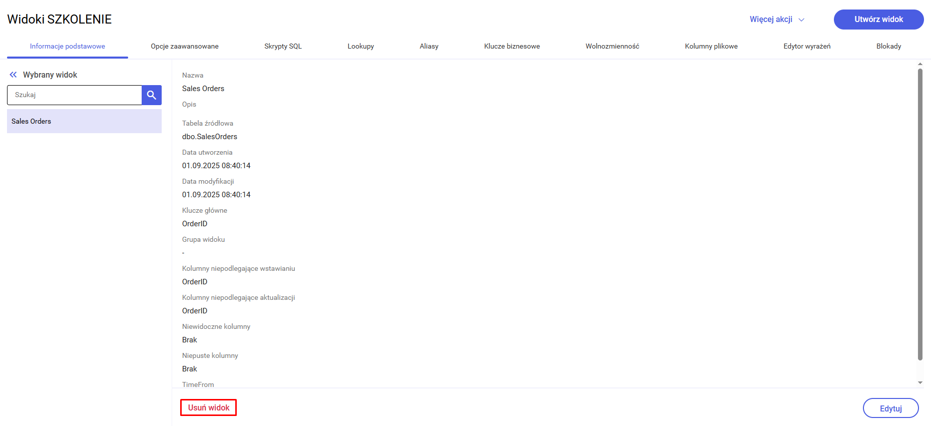 W zakładce Widoki istnieje możliwość usuwania widoków. W celu usunięcia widoku należy wybrać widok z listy po lewej stronie a następnie należy kliknąć przycisk .