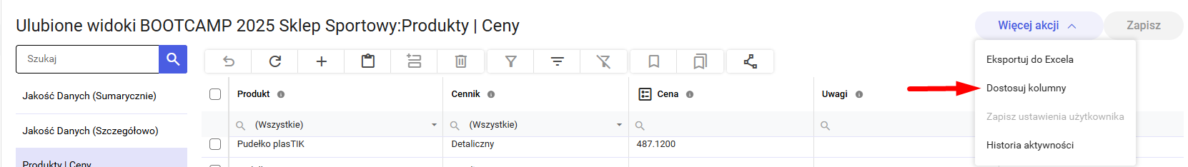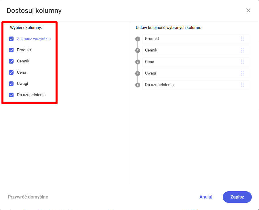 Użytkownik ma możliwość wyselekcjonowania kolumn, które chce widzieć w przeglądanej tabeli. Wyboru kolumn dokonuje przy użyciu opcji „Dostosuj kolumny”.