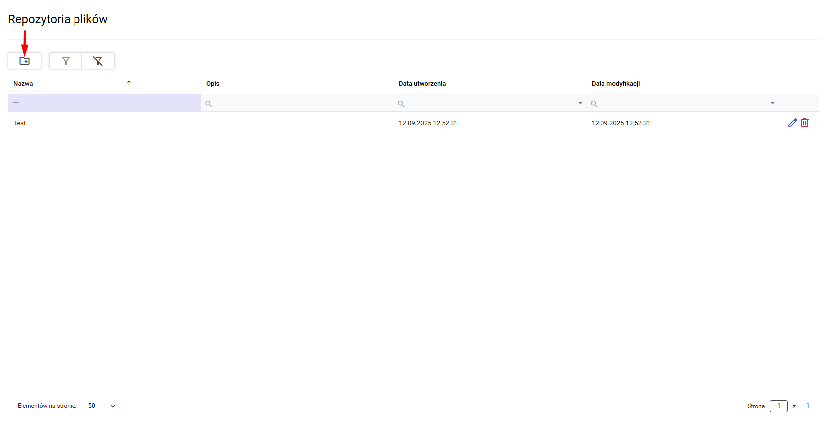 W celu dodania nowego repozytorium należy w polu „Nazwa repozytorium” wpisać nazwę dla repozytorium. Opcjonalnie można dodać opis dla repozytorium. Dodanie repozytorium potwierdzamy przyciskiem . Anulacja jest dostępna pod przyciskiem