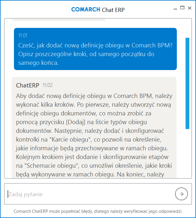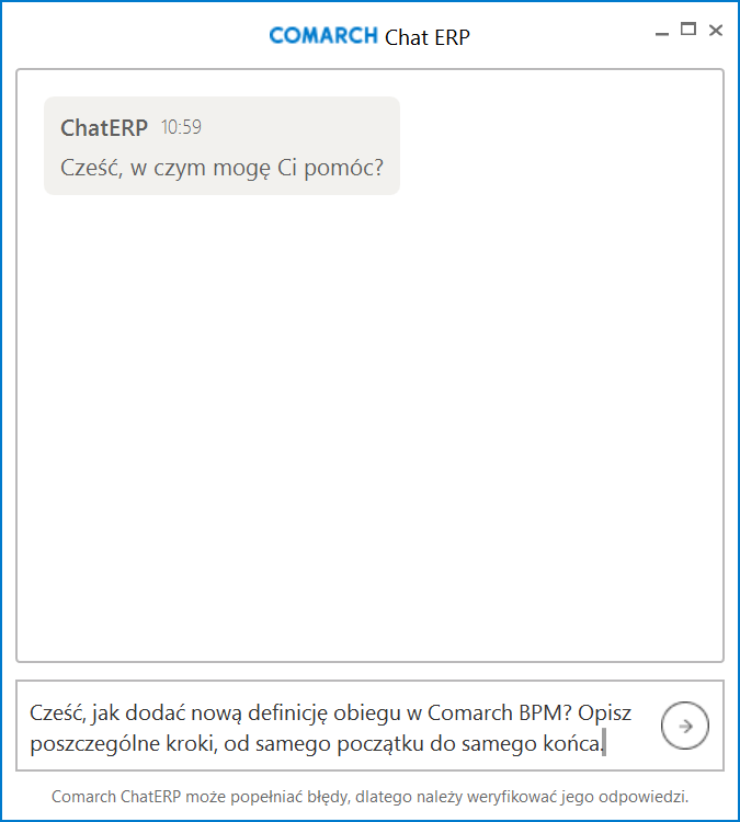 [Rozpocznij rozmowę]. Wówczas zostanie otwarte okno aktywnej konwersacji, w którym można prowadzić rozmowę z ChatERP. W dolnej części okna dodano komunikat: „ Comarch ChatERP może popełniać błędy, dlatego należy weryfikować jego odpowiedzi”. Takie okno będzie od tej pory wyświetlane wszystkim uprawnionym operatorom z danej spółki (o danym numerze NIP).