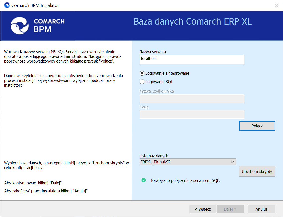 Kiedy wykonywanie skryptów zakończyło się sukcesem, wyświetlona zostaje informacja „Skrypty SQL zostały wykonane pomyślnie”, a użytkownik może nacisnąć przycisk [Dalej], aby przejść do kolejnego kroku instalacji: