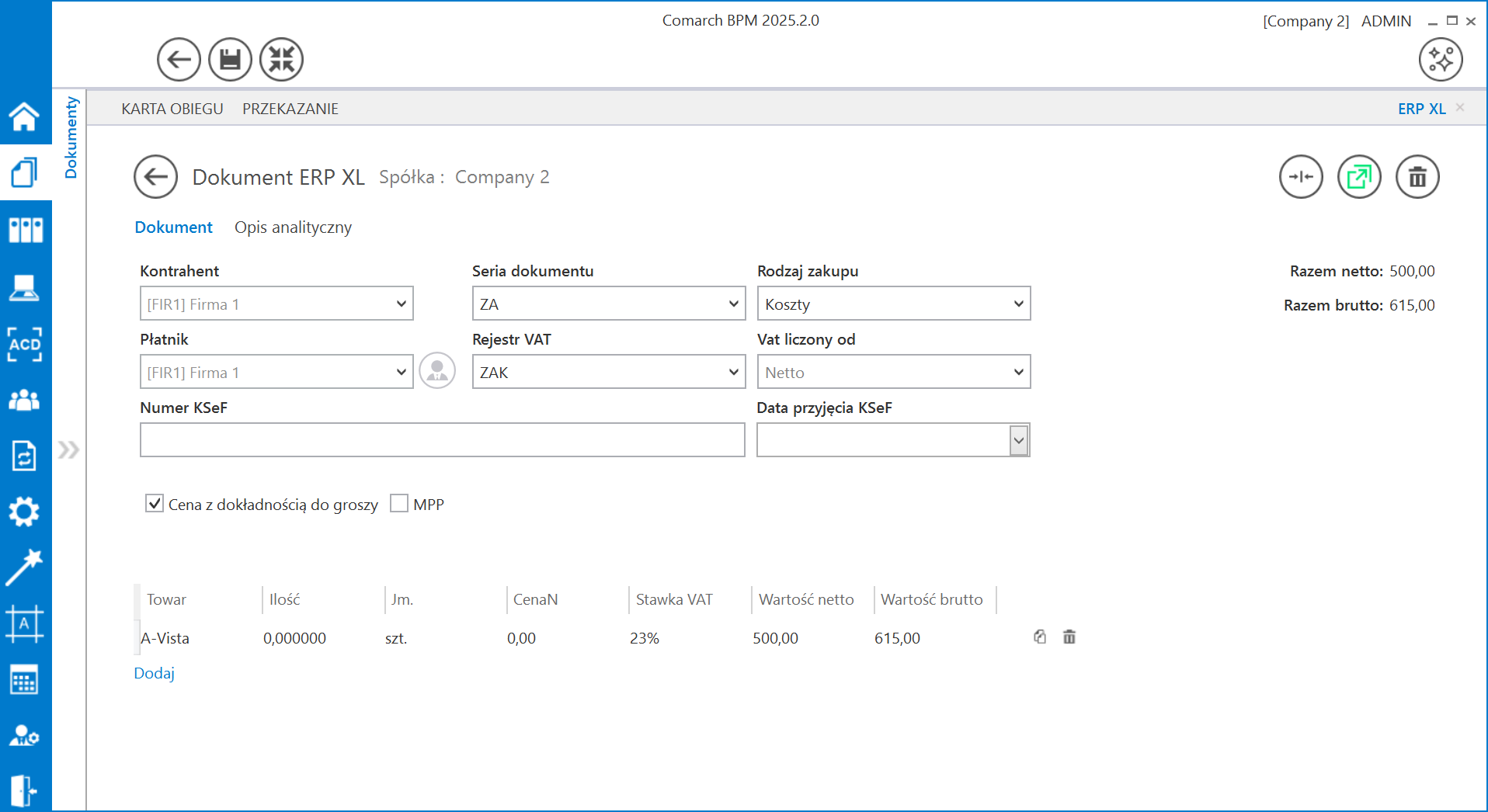 Funkcjonalność wpływa na mechanizm mapowania wartości w kontrolce na Karcie Obiegu na kontrolkę Dokument ERP XL. Zmiana „Vat liczony od” na wartość „Brutto” uniemożliwi wygenerowanie dokumentu. Dla dokumentów typu Avista wartość z karty obiegu przenoszona jest do kontrolki „CenaN” (dokumenty: (A)FZ i (A)FS) lub „Wartość netto” (dokumenty: AFZK).