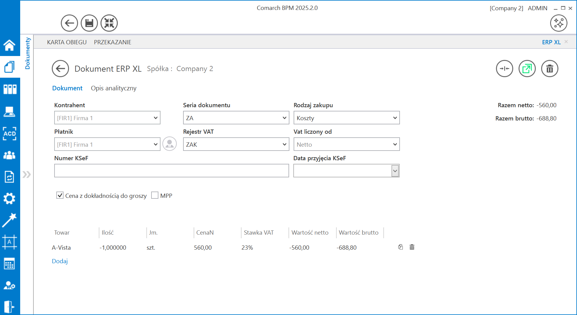 wygenerowanie nowego dokumentu w Comarch ERP XL,