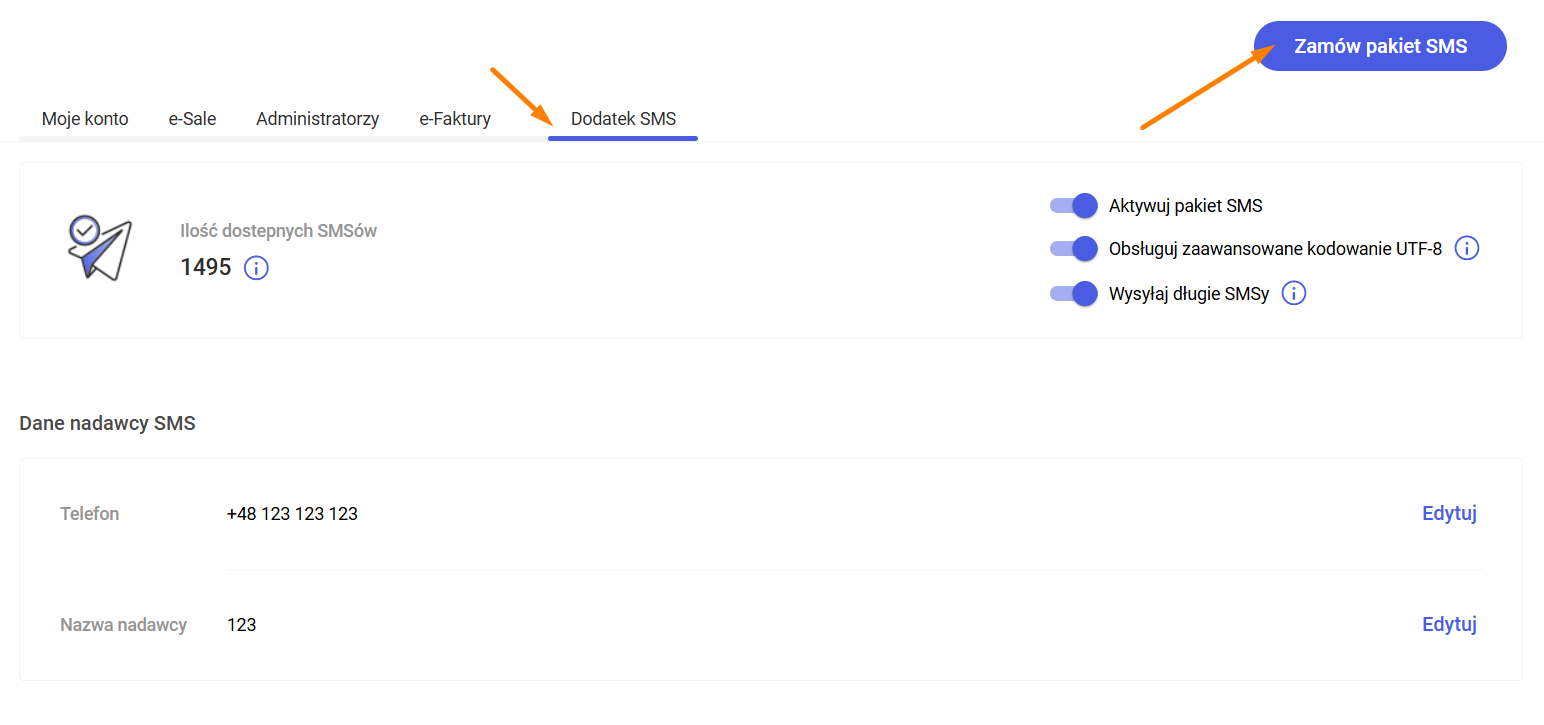 Krok 3. Wybierz sposób płatności oraz uzupełnij dane zamawiającego. Przekierowanie do serwisu płatności nastąpi po zaznaczeniu wymaganych zgód i oświadczeń oraz kliknięciu przycisku Zapłać. Gotowe! Twoje zamówienie zostało złożone i przekazane do dalszej realizacji. Krok 1. W panelu administracyjnym przejdź do sekcji Mój profil > Dodatek SMS > Zamów pakiet SMS: Krok 2. W widocznym formularzu uzupełnij pole Liczba pakietów, a następnie kliknij Zamów i zapłać. Krok 3. Wybierz sposób płatności oraz uzupełnij dane zamawiającego. Przekierowanie do serwisu płatności nastąpi po zaznaczeniu wymaganych zgód i oświadczeń oraz kliknięciu przycisku Zapłać. Gotowe! Twoje zamówienie zostało złożone i przekazane do dalszej realizacji. Aby aktywować możliwość wysyłania w wiadomościach SMS m.in. polskich znaków diakrytycznych należy przejść do sekcji Mój profil > Dodatek SMS a następnie włączyć parametr Obsługuj zaawansowane kodowanie UTF-8 . Aktywacja parametru spowoduje, że w treściach wiadomości SMS wprowadzić będzie można maksymalnie 70 znaków. Wyjątek stanowi cyrylica oraz znak €, dla których system automatycznie wykrywa znaki UTF-8 i ogranicza zapis treści do maksymalnie 70 znaków. W przypadku braku aktywnego parametru znaki tj. ‘|‘, ‘^‘, ‘{‘, ‘}‘, ‘[‘, ‘]‘, ‘~‘, ‘\‘ będą liczone podwójnie. Zasady bilingowania wiadomości dostępne są w dokumentacji SerwerSMS.pl Aby aktywować możliwość wysyłania długich wiadomości SMS należy przejść do sekcji Mój profil > Dodatek SMS, a następnie włączyć parametr Wysyłaj długie SMSy. Aktywacja parametru oferuje możliwość wysyłania wiadomości tekstowych przekraczających standardowy limit 160 znaków. Funkcjonalność ta jest dostępna w wybranych pakietach. Maksymalna długość jednej wiadomości przesyłanej przez SerwerSMS.pl wynosi aż 918 znaków. Obecne telefony komórkowe obsługują funkcję łączenia kilku SMS-ów w jedną spójną wiadomość. Podczas edycji treści formalnych wiadomości SMS w panelu administracyjnym Comarch e-Sale system wskazuje, ile wiadomości składa się na jedną wysyłaną wiadomość. Ostatecznie odbiorca otrzyma jedną, połączoną, długą wiadomość. Przy zastosowaniu długich wiadomości naliczane są odpowiednie opłaty zgodnie z poniższą tabelą oraz dokumentacją SerwerSMS.pl