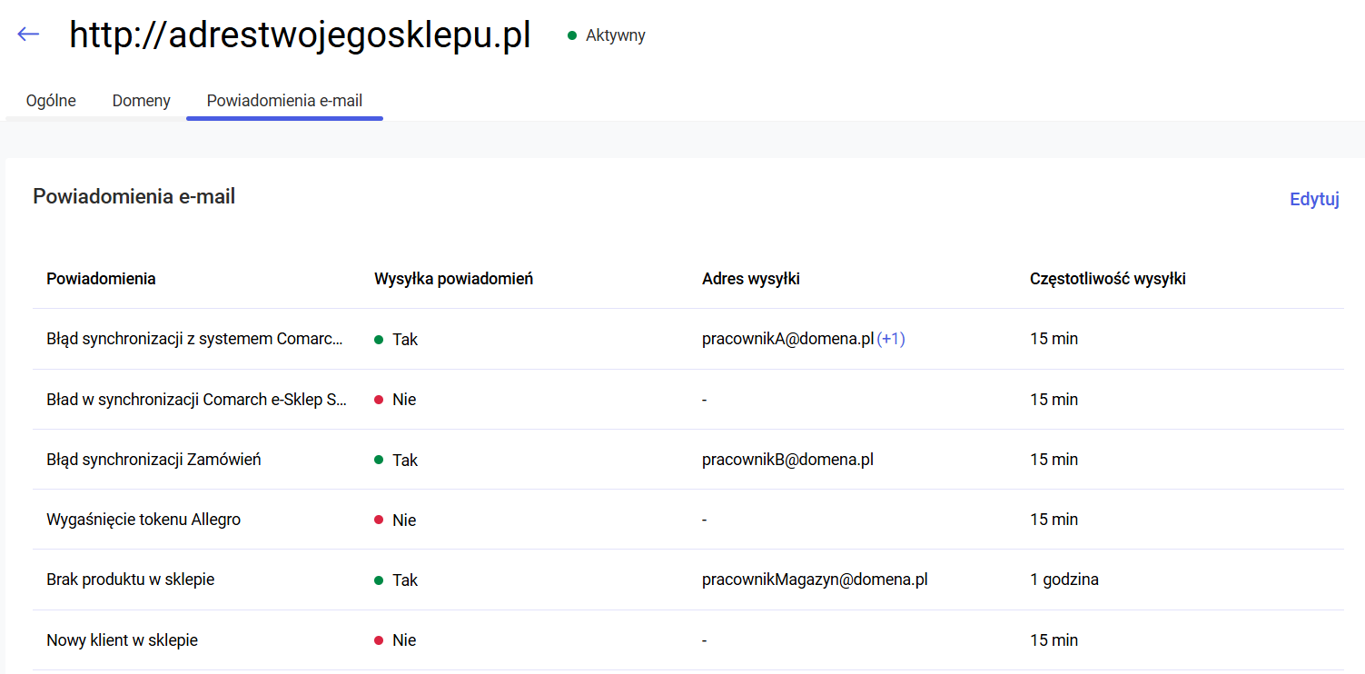 - dodanie faktury – informuje klienta o tym, że udostępniono fakturę do zamówienia. Wiadomość zostaje wysłana po skonfigurowaniu faktur elektronicznych w systemie ERP, wystawienia takiej faktury do zamówienia oraz przesłania do Comarch e-Sale. Dodatkowo po zaznaczeniu parametru Faktura w formacie pdf do wiadomości e-mail zostanie dołączona faktura (jeżeli zostanie odpowiednio skonfigurowana w systemie ERP).