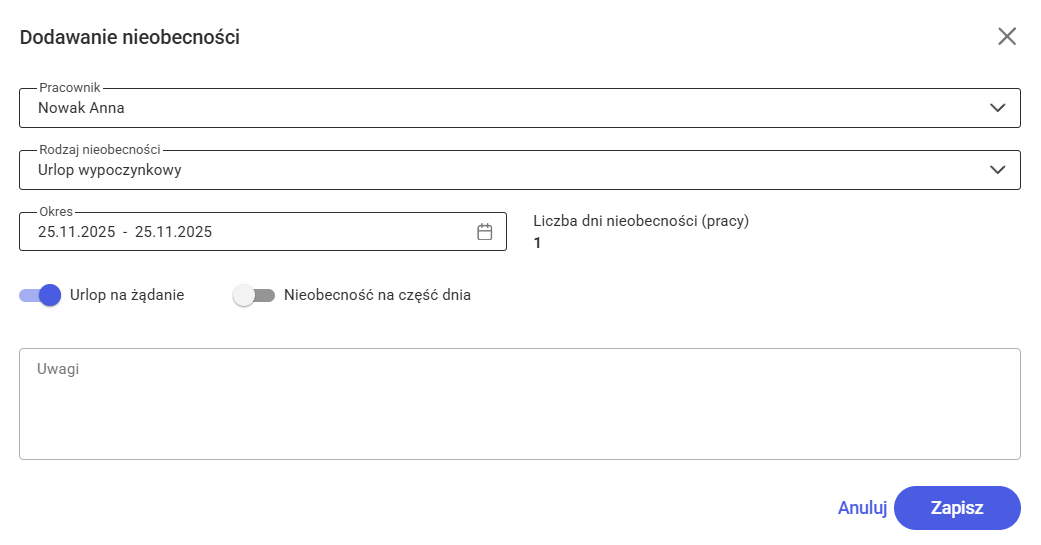 Tak, z poziomu Comarch ERP HR istnieje możliwość odnotowania urlopu na żądanie. Opcja ta jest dostępna z poziomu zakładki Nieobecności dla nieobecności o rodzaju Urlop wypoczynkowy.