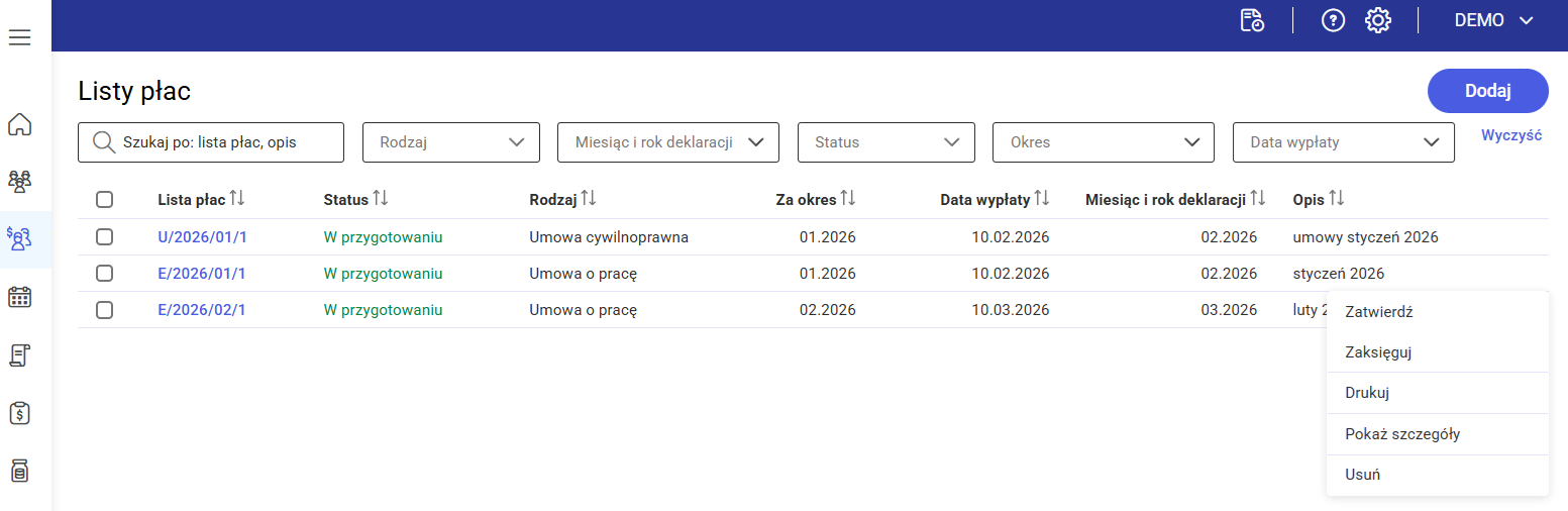 Aby wygenerować wydruk należy kliknąć ikonę trzech kropek przy danej liście płac a następnie wybrać opcję Drukuj