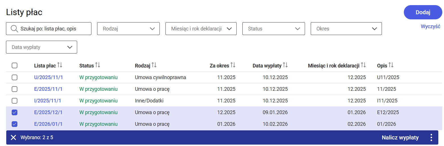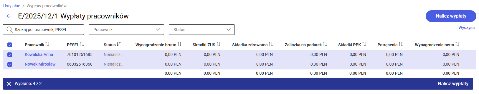 Seryjnie dla wszystkich pracowników w ramach wielu list płac – poziomu okna Listy płac poprzez zaznaczenie wybranych list i wybór opcji Nalicz wypłaty.