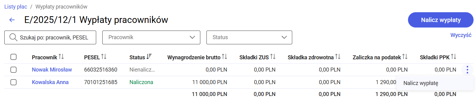 Pojedynczo dla wybranego pracownika z poziomu wybranej listy płac poprzez wybór opcji Nalicz wypłatę dostępnej pod trzykropkiem lub poprzez kliknięcie w nazwisko pracownika