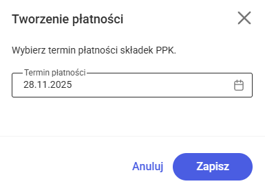Aby utworzyć przelew z płatnością składek, należy ustawić się na konkretnej płatności na liście, a następnie z menu pod trzema kropkami wybrać opcję Utwórz płatność. Po jej wybraniu, pojawi się okno, gdzie Użytkownik będzie mógł wskazać termin płatności składek PPK. Domyślnie termin płatności ustawia się na dzień bieżący z możliwością zmiany na datę późniejszą, ale nie wcześniejszą niż dzień bieżący. Po zapisaniu zmian, status płatności na liście zmieni się z Brak na Utworzono.