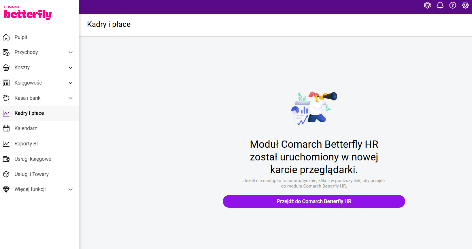 Po jej wybraniu moduł kadrowo-płacowy uruchamiany jest w nowej karcie przeglądarki. Przy pierwszym uruchomieniu modułu automatycznie wykonywana jest migracja danych zapisanych w Comarch Betterfly.
